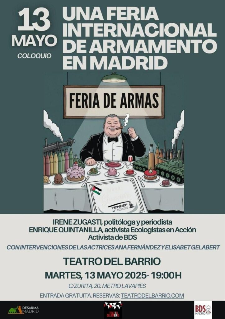Coincidiendo con la feria de armas hay previstos varios actos: Uno en el Teatro del Barrio, para el que puedes sacar entrada gratuita en el siguiente enlace:< https://teatrodelbarrio.com/una-feria-internacional-de-armamento-en-madrid/ >Y una concentración de protesta el último día de la feria, 14 de mayo, ante el Cuartel General del Ejército en Cibeles a las 19.30.
